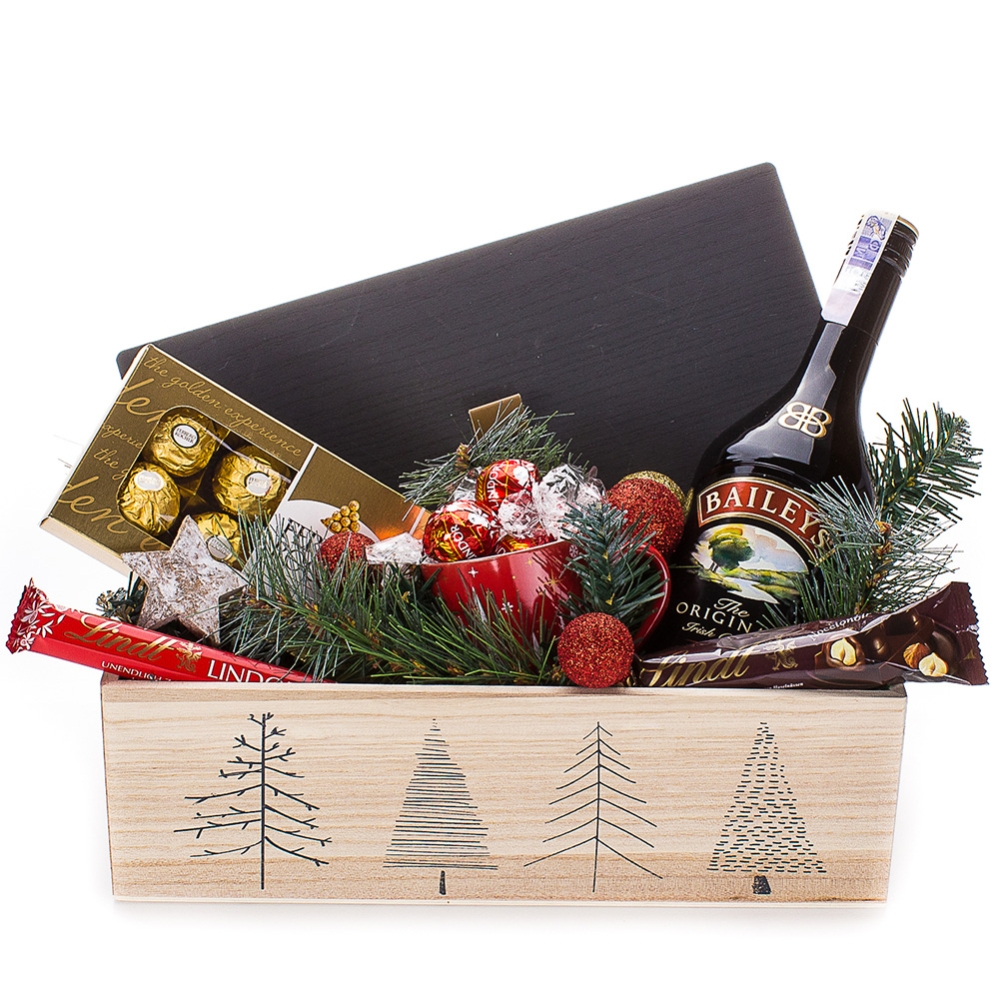 :Тематична дървена кутия - размери 32.5/18.10.5 см Ликьор Baileys 0.700 л - 1 бр. Шоколадови бонбони Ferrero Rocher 100 гр. - 1 бр. Тематична порцеланова чаша - 1 бр. Шоколадов стик Lindor 38 гр. - 1 бр. Шоколадов стик Lindt noccionor 40 гр. - 1 бр. Насипн