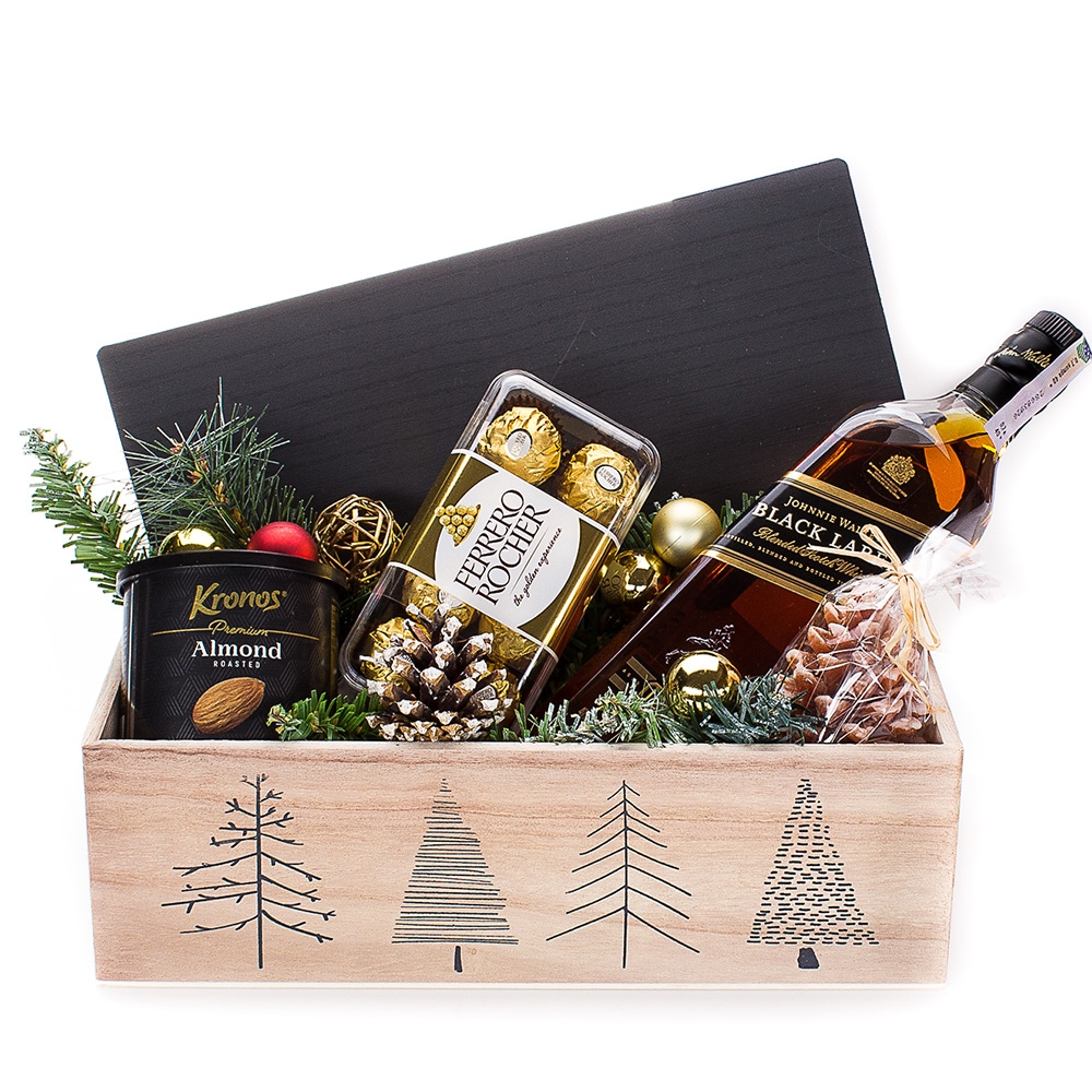 :Тематична дървена кутия - размери 32.5/18.10.5 см Отлежало уиски Johnie Walker black label 0.7 л - 1 бр. Бадеми в кен Kronos 150 гр. - 1 бр. Шоколадови бонбони Ferrero Rocher 200 гр. - 1 бр. Коледна свещ - шишарка Коледна украса -